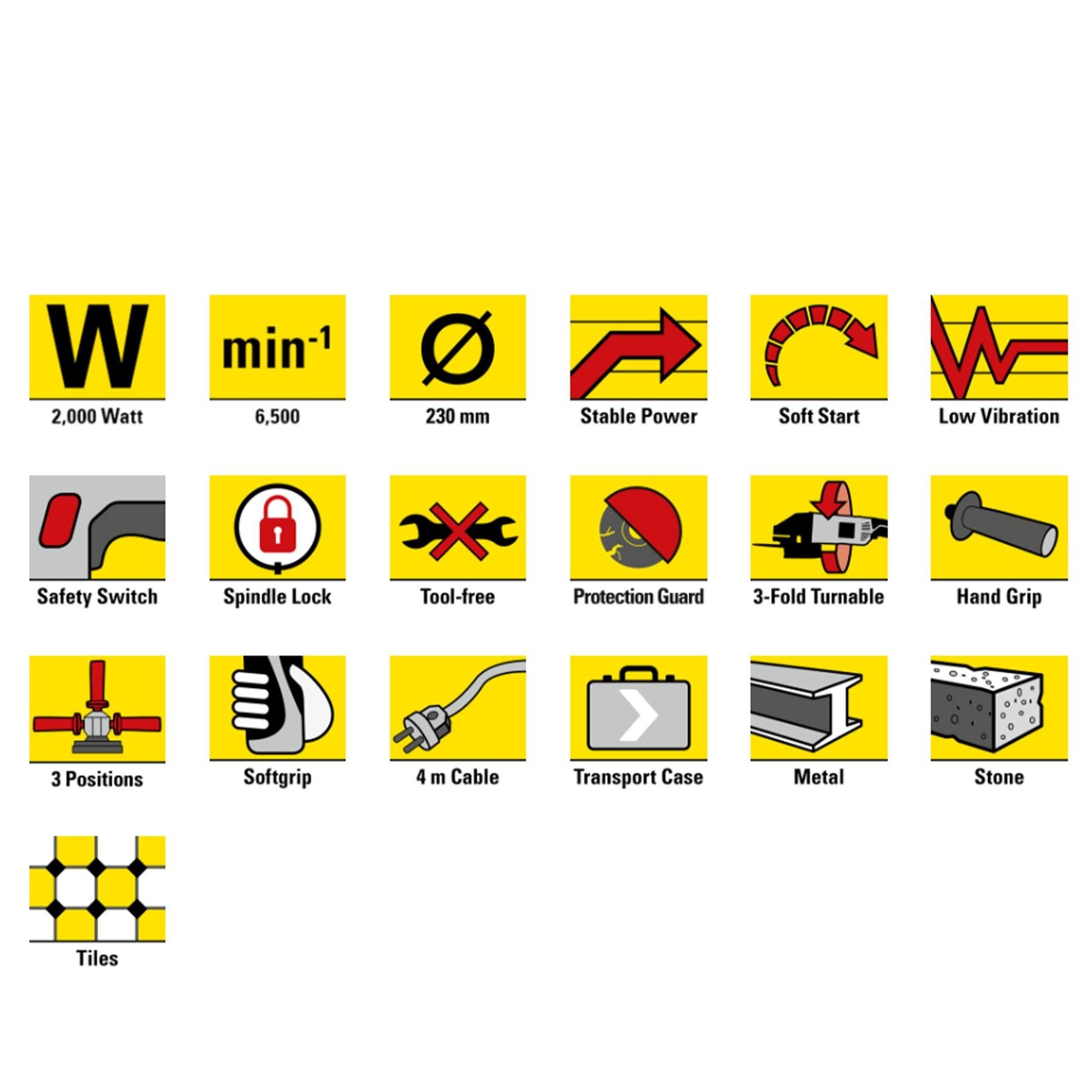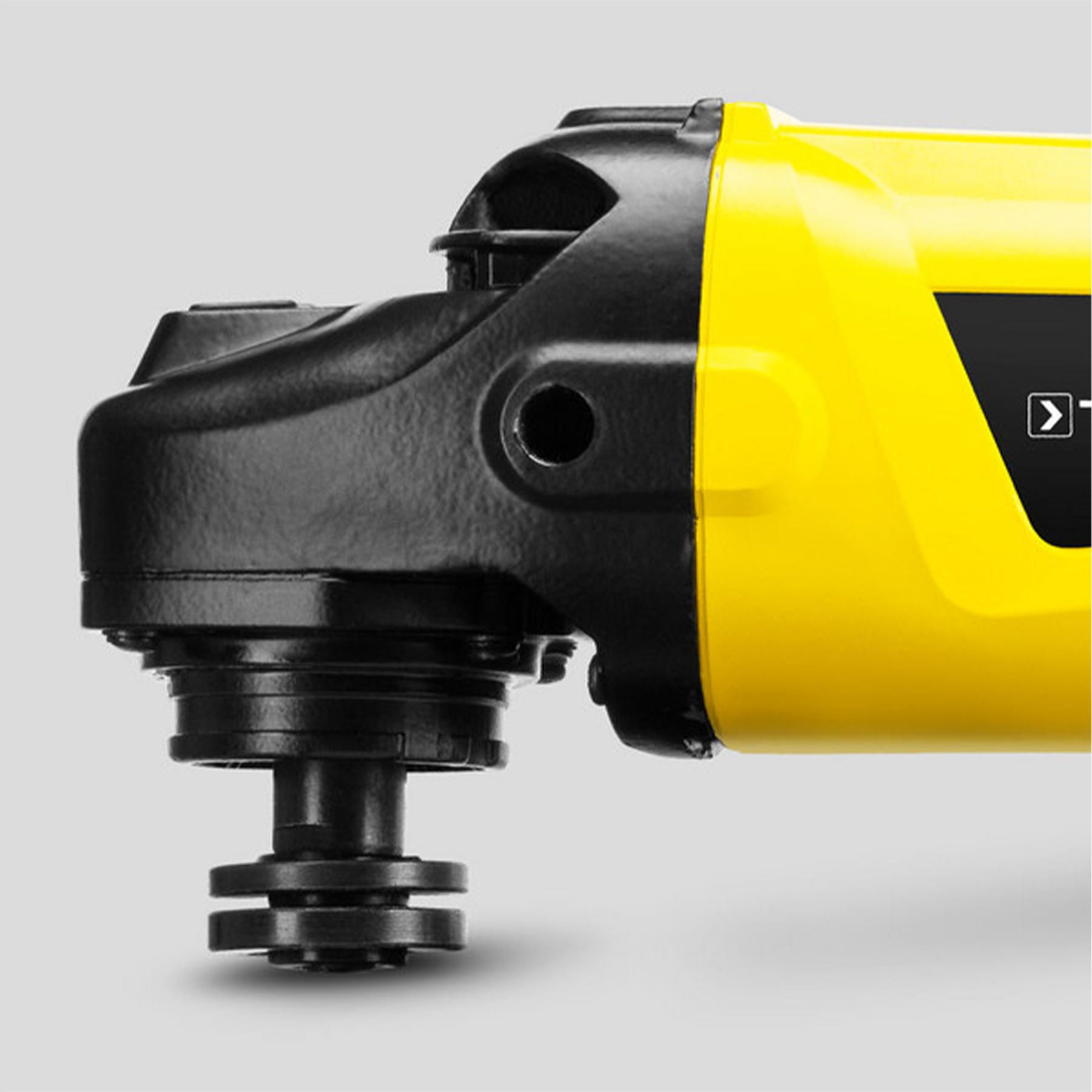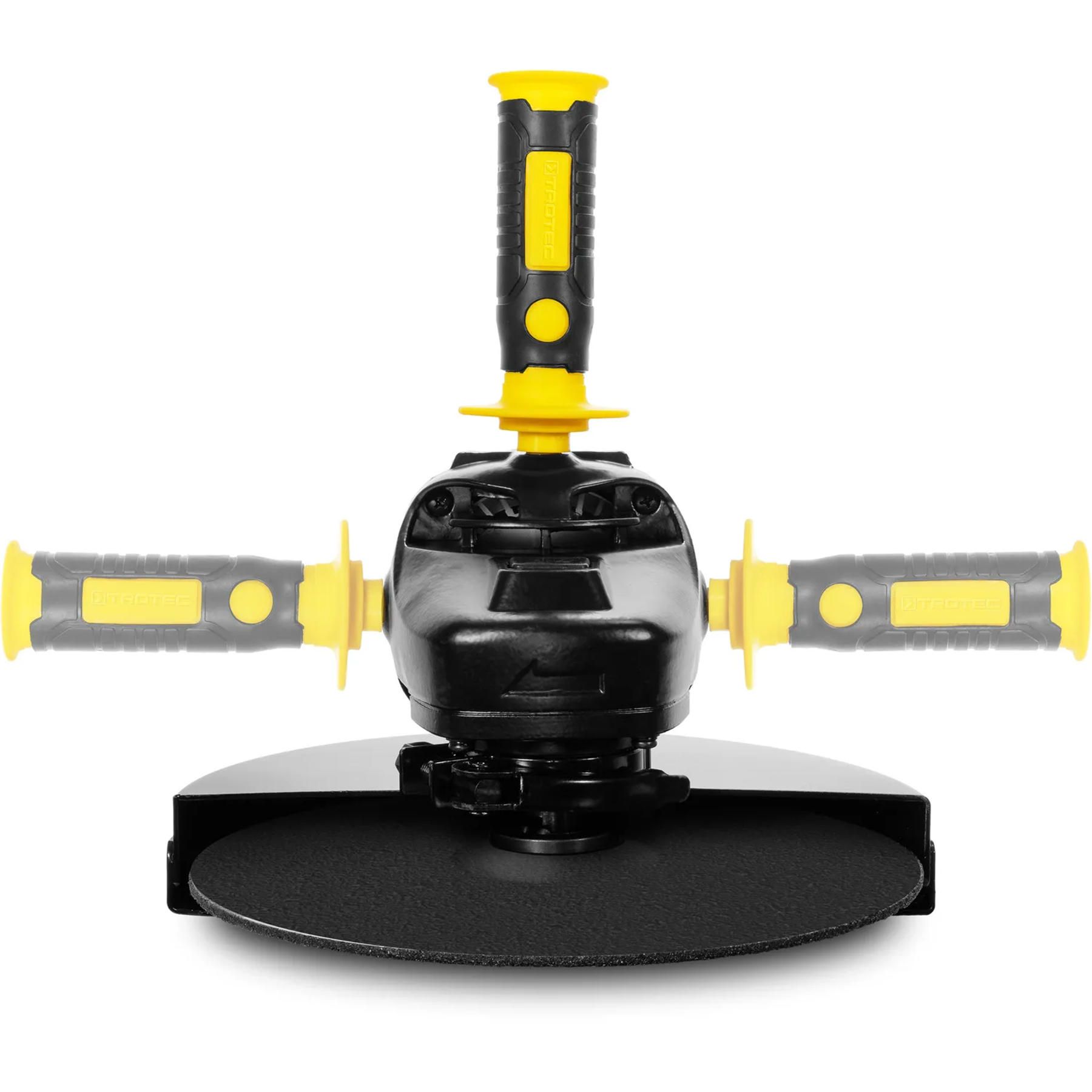 Поворотна на 180° основна ручка забезпечує низький рівень вібрації, а головне дозволяє розвертати електродвигун з редуктором і диском відносно ручки таким чином, щоб виконання робіт (будь то різання чи шліфовка) було максимально зручним і безпечним. Плавний пуск і обмежувач пускового струму також роблять роботу з кутовою шліфмашиною безпечнішою і не перевантажують електромережу.