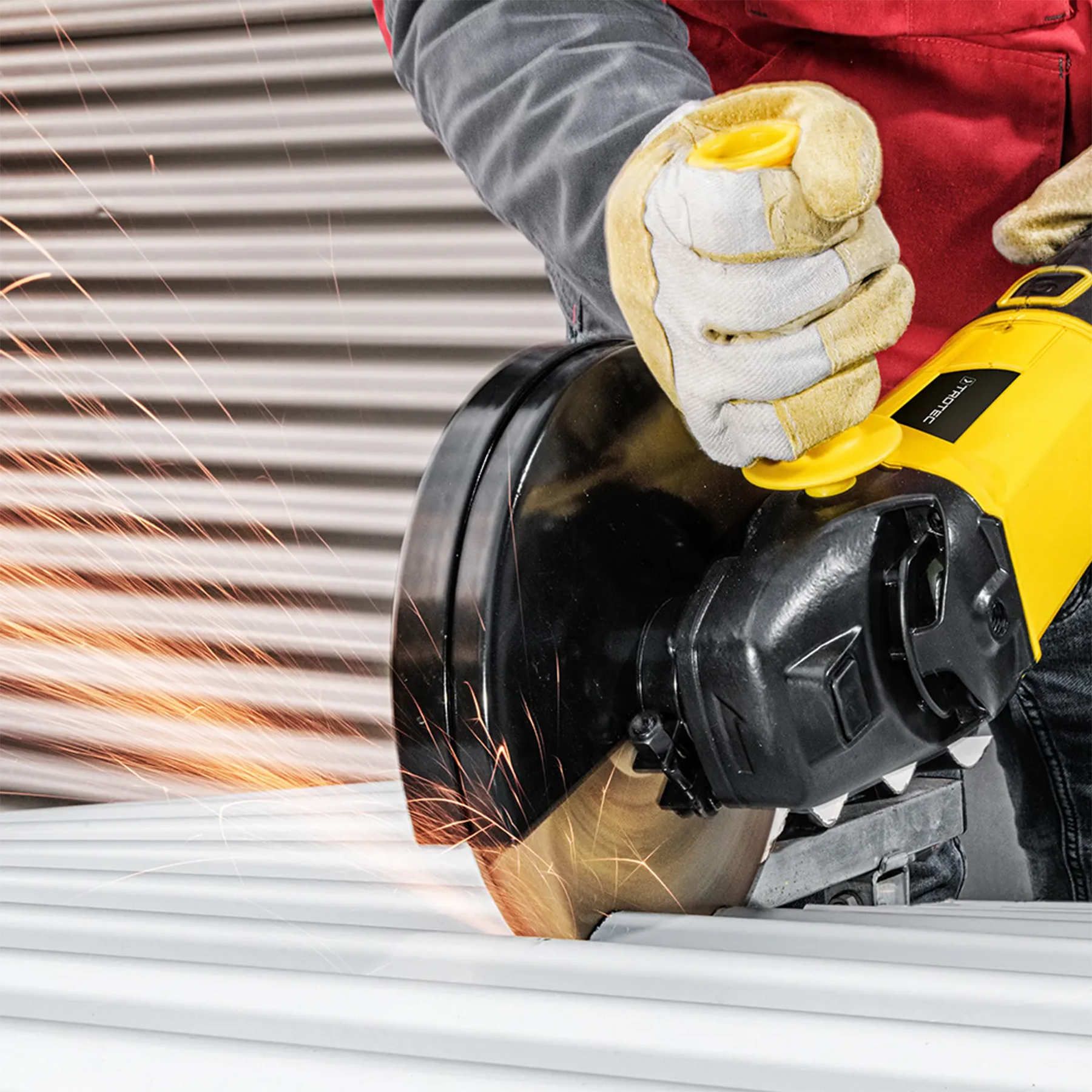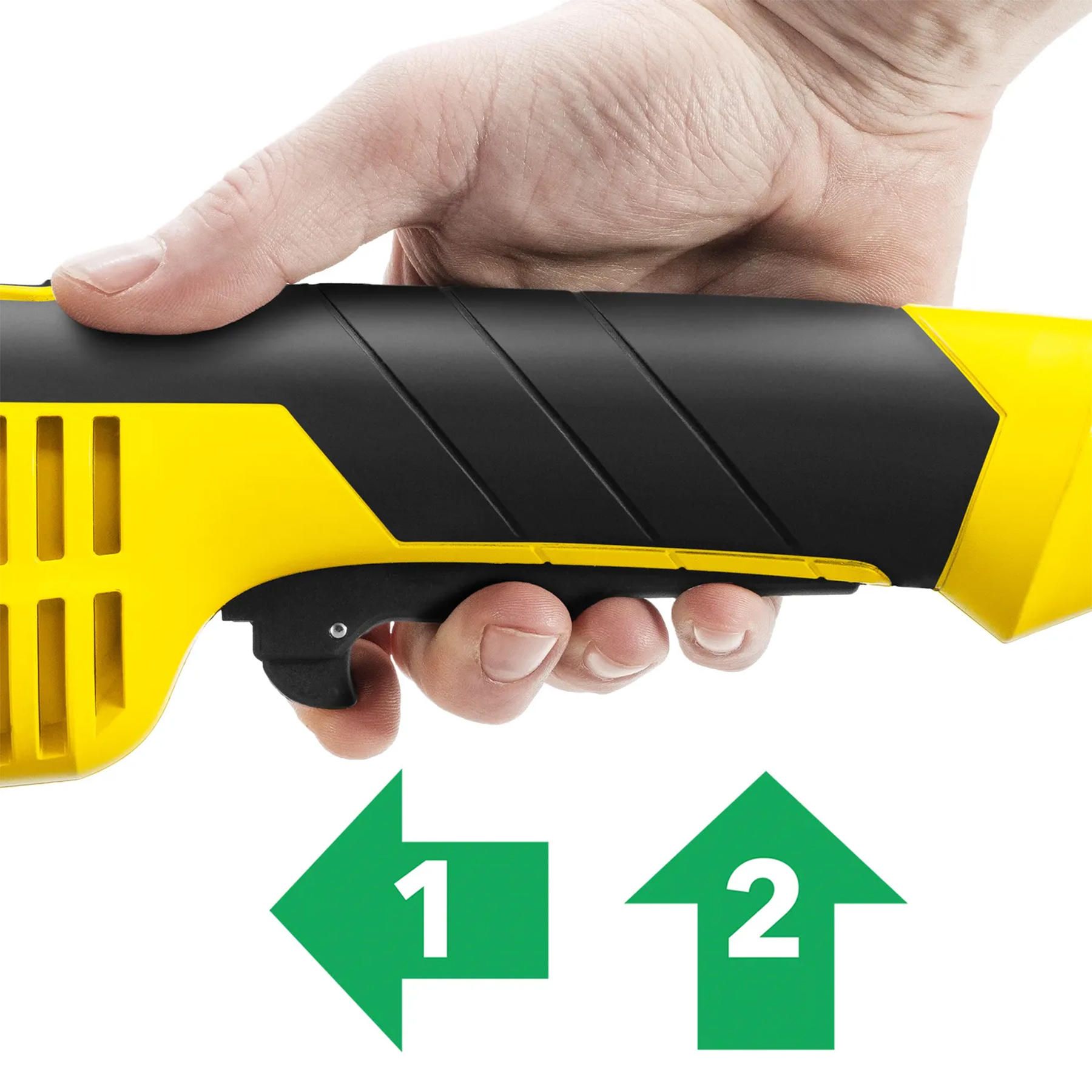 Інструмент розроблений для легкого та безпечного використання завдяки ергономічній довгій ручці з гумовими вставками. Додаткове руків'я забезпечує роботу двома руками без втоми і може бути встановлене в трьох положеннях, горизонтально або вертикально, або щоб підготувати кутову шліфувальну машину для шульги. Це означає, що пристрій завжди надійно лежить у руці, навіть під час тривалої роботи. Так само зручно над кнопкою пуску розташована кнопка, що запобігає випадковому увімкненню пристрою, отже увімкнути пристрій можна одним пальцем однієї робочої руки.