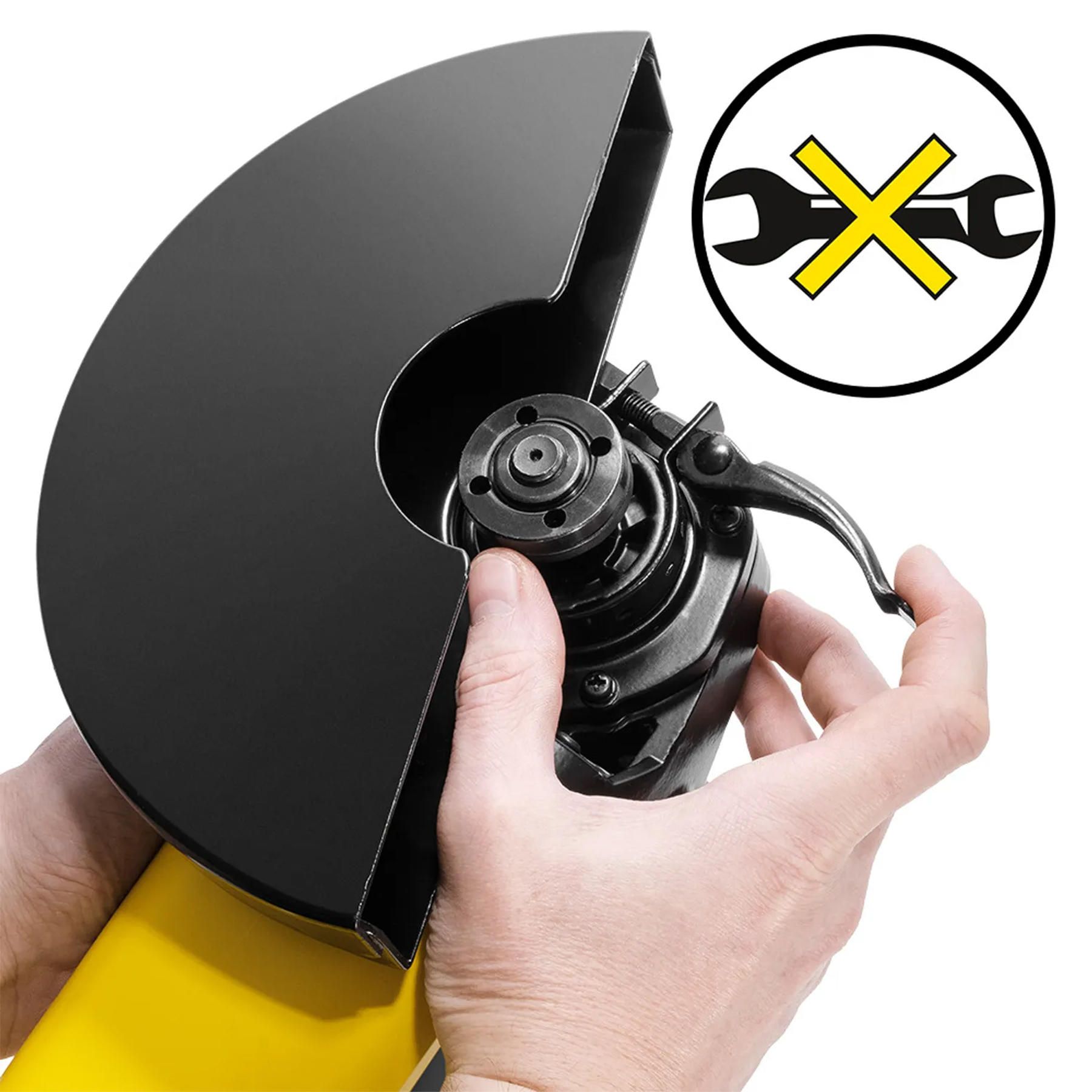 Положення захисного кожуха шліфувальної машини можна швидко змінювати за допомогою ексцентрикового важеля без додаткових інструментів. Крім того, кутова шліфувальна машина оснащена фіксатором шпинделя, що робить можливим просту і швидку зміну диску.