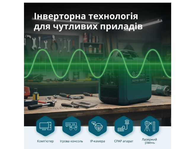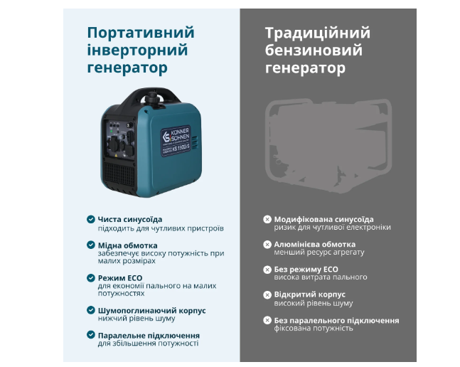 Інверторний генератор KS 1900i S (2,0 кВт) від Könner & Söhnen забезпечує стабільне живлення та безпечний роботу чутливої електроніки, такої як медичне обладнання, комп'ютери та високоточні прилади. Компактний і тихий, має шумопоглинаючий корпус, економічний режим, ідеально підходить для житлових зон, кемпінгу та подорожей. Підтримує паралельне підключення для збільшення потужності. Двигун відповідає стандарту EURO 5. Безщітковий альтернатор із 100% мідною обмоткою гарантує надійну роботу навіть під навантаженням. Стильний дизайн і мобільність роблять модель зручним джерелом резервної енергії.