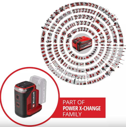 Акумуляторна електростанція Einhell TC-ES 18/150/1 Li-Solo належить до сімейства Power X-Change та забезпечує мобільне живлення. Усі акумулятори цієї системної серії сумісні з інвертором. Він перетворює енергію акумулятора таким чином, щоб можна було працювати або заряджати інші електричні пристрої. Акумулятор Power X-Change не входить до комплекту.