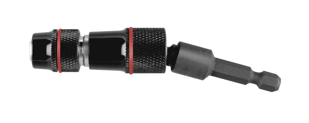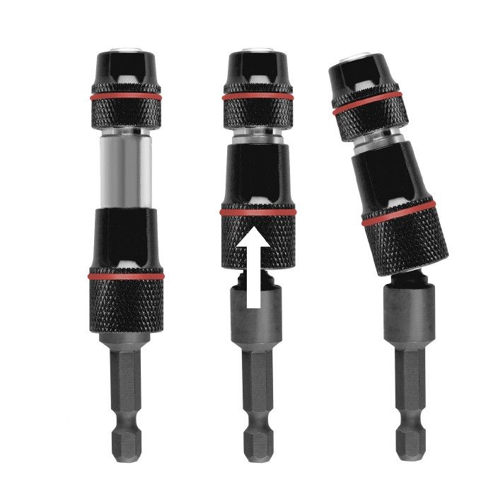 Держатель бит для инструментов Triple Fix с быстрой заменой бит оснащён поворачивающейся до 20° круглой головкой для завинчивания винтов в недоступных местах, т.е. там, где прибор со сверлильным патроном был бы только помехой. Благодаря тому, что имеется возможность отодвинуть назад свободно вращающуюся направляющую втулку, поворотную круглую головку можно отключить и использовать в качестве держателя бит для инструментов. Крепление для шестигранника 1/4“ в соответствии с ISO 1173, с сильным постоянным магнитом из неодима, пружинным кольцом. Имеется функция быстрой замены, возможно обслуживание одной рукой, извлечение наконечника с помощью простого вытягивания металлической втулки. Шестигранный хвостовик 1/4“, крепление в соответствии с ISO 1173, E 6.3.