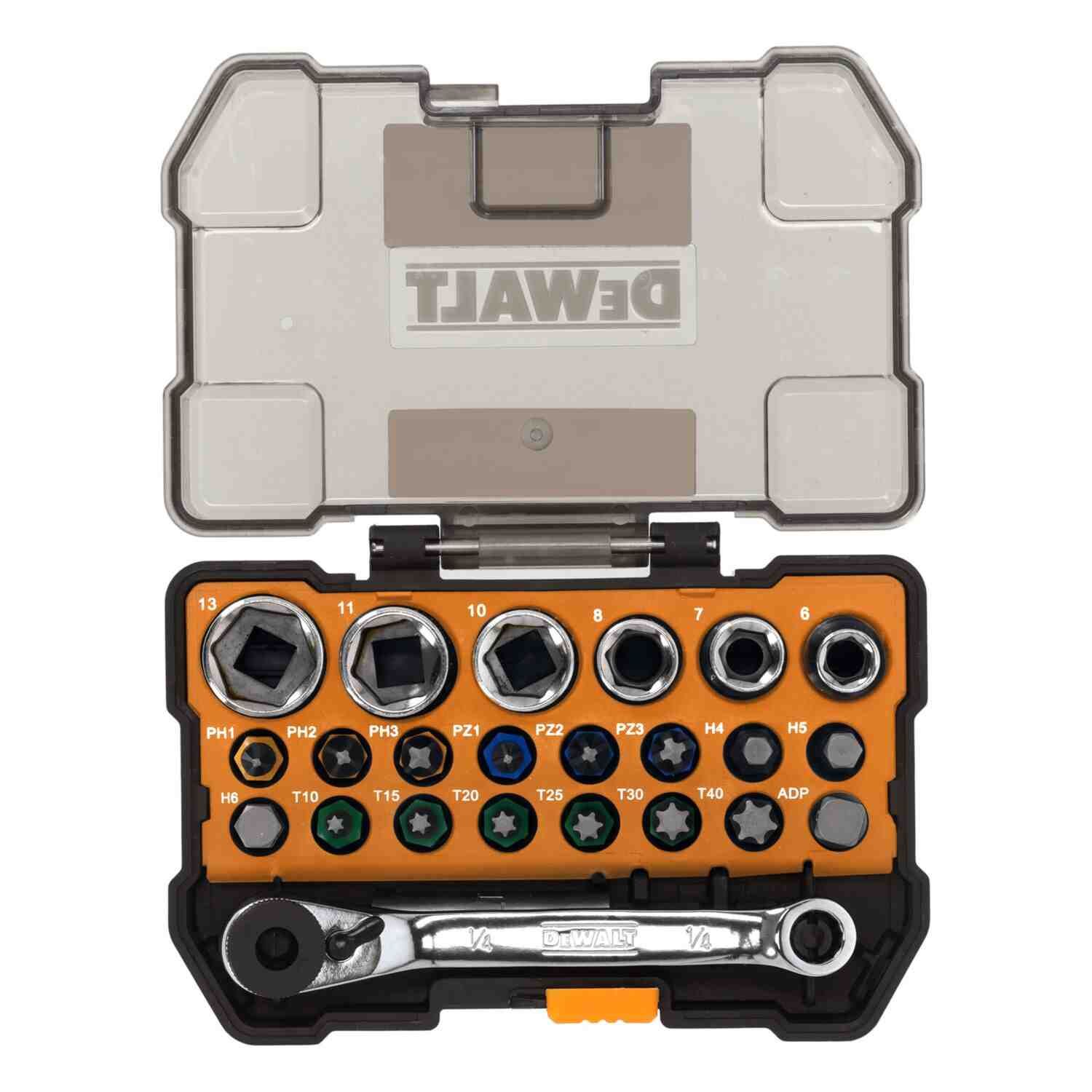 Комплектація:Упаковка: футляр;. Головки торцеві - 6, 7, 8, 10, 11, 13 мм;. Біти 25 мм - Ph1, Ph2, Ph3, Pz1, Pz2, Pz3, T15, T20, T25, T27, T30, T40, Hex 4, Hex 5, Hex 6;. Ключ з реверсивним храповим механізмом;. Магнітний тримач біт;. Адаптер під торцеві головки.
