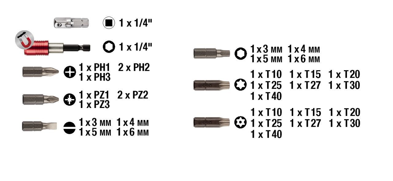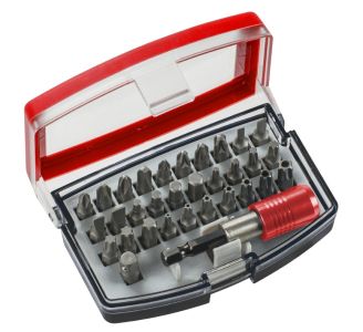 Коробка для бит на 32 элемента., хромованадиевая сталь, в высококачественной пластиковой коробке с практичным зажимом для ремня, 30 бит, хвостовик 1/4" шестигранный по ISO 1173, C 6.3, 25 мм, 1 съемный держатель бит, 1 гнездовой адаптер