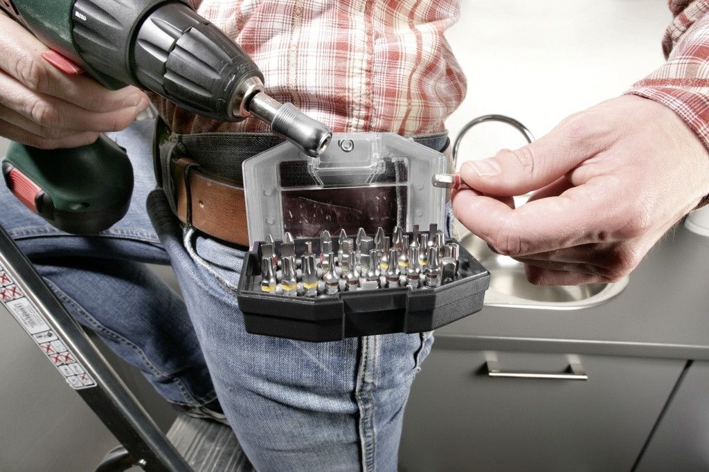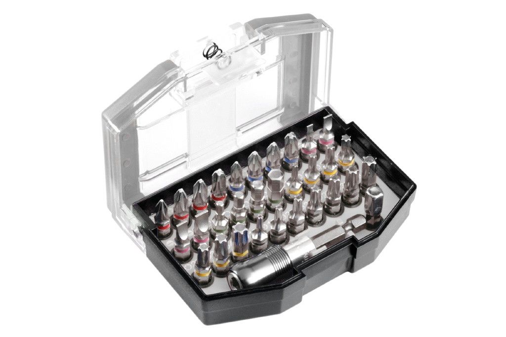 Сменные насадки в коробке, 32 предмета. Биты: привод 1/4“ шестигранный по стандарту ISO 1173, C 6.3, промышленное качество, с цветными маркировочными кольцами, для различения формы головки, быстросменный держатель насадок с приводом 1/4“ шестигранным по стандарту ISO 1173, E 6.3, коробка с практичным зажимом для ношения на ремне.