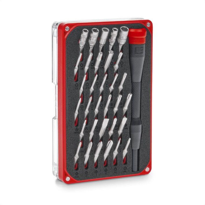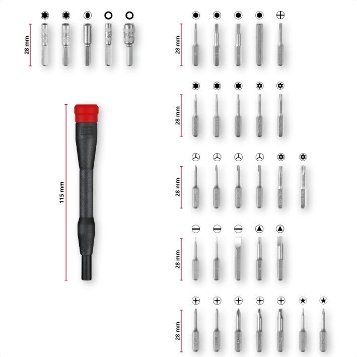 Ремонтный набор прецизионных бит Einhell из 33 предметов – это компактный набор инструментов с важнейшими инструментами для механических работ, ремонта и обслуживания небольших электронных устройств, таких как смартфоны и ноутбуки. Набор точной механики включает 27 прецизионных насадок из высококачественной стали S2 с размерами PH0/PH000/PH1/PH2/SL1/SL2.5/SL4/T3/T4/T5/TT6/TT8/TT10/TT15/P2/P5/H1. / H2.5 / H3 / H4 / Y000 / Y00 / Y0 / Y1 / TA2 / TA3 / STANDOFF. Биты оснащены 4-мм шестигранным хвостовиком. Для очень высокой стойкости к коррозии и лучшей оптике прецизионные биты имеют никелевое покрытие. Кроме того, ремонтный набор включает пять точных хромованадиевых головок с шестигранным хвостовиком 4 мм, совместимых со многими точными отвертками. Среди них торцевые головки для устройств с предохранительным креплением размеров 3,8/4,5, насадка с овальной головкой и шестигранная головка для электронных устройств с маленькими винтами размеров 2,5/5. В комплект входит пластиковый держатель/отвертка для бит. Благодаря вращающемуся колпачку можно легко работать одной рукой. Инструмент выталкивания SIM-карты встроен во вращающийся колпачок для вставки или извлечения SIM-карт в смартфон. Для организованного хранения практичный ящик для хранения с четырьмя магнитными точками обеспечивает хорошую фиксацию между полом и крышкой. Кроме того, прозрачная крышка коробки позволяет быстро осматривать содержащиеся компоненты. Благодаря особо удобным инструментам набора прецизионных отверток из 33 предметов, он особенно подходит для точной работы с чувствительными электронными устройствами.