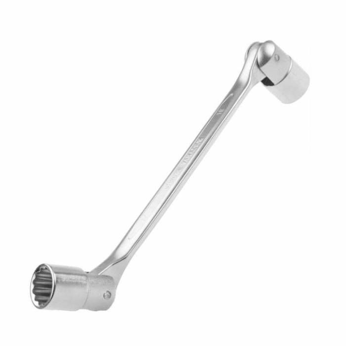 Ключ має вигнуту форму, виготовлений з хромованадієвої сталі. Матеріал має підвищену стійкість до корозії, що подовжує термін служби ручного інструменту.