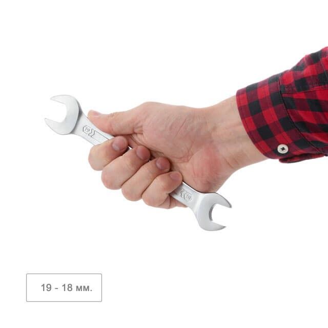 Ключ рожкового типа, размером 18 и 19 мм предназначен для монтажа и демонтажа резьбовых соединений гаек и болтов.