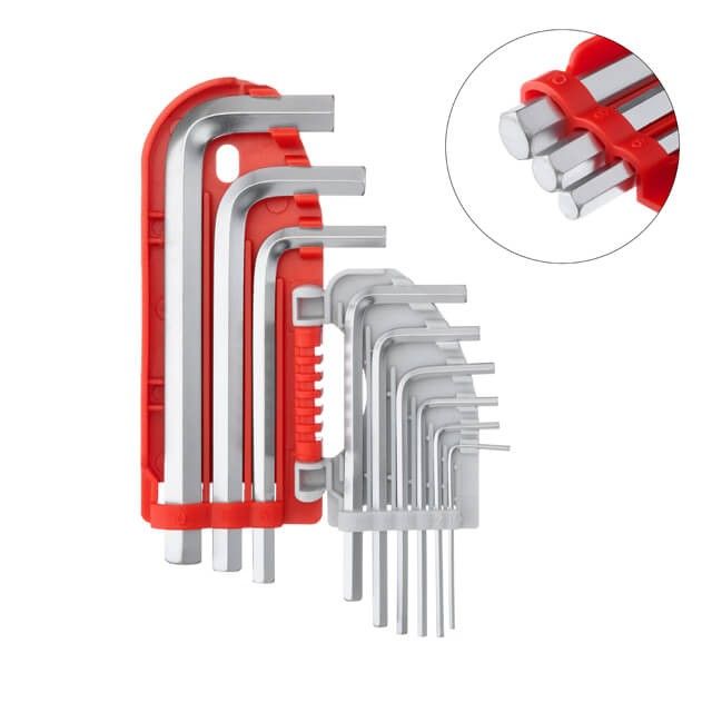 Укороченная ножка инструментов для компактного хранения обеспечивает максимальный крутящий момент. 9 метрических шестигранных ключей размещаются в пластиковом держателе с маркировкой размера, набор удобно хранить, ключи не теряются, также можно положить их в ящик к другим инструментам.