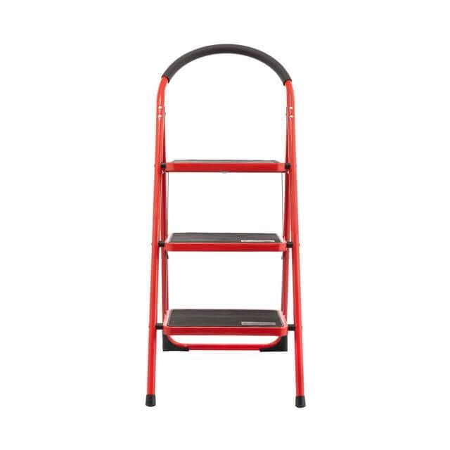 Предусмотрена система безопасности для защиты от случайного складывания стремянки во время работы (на последней ступени есть специальный металлический крюк, который фиксирует откидную часть). Ножки оснащены пластиковыми башмаками против скольжения.