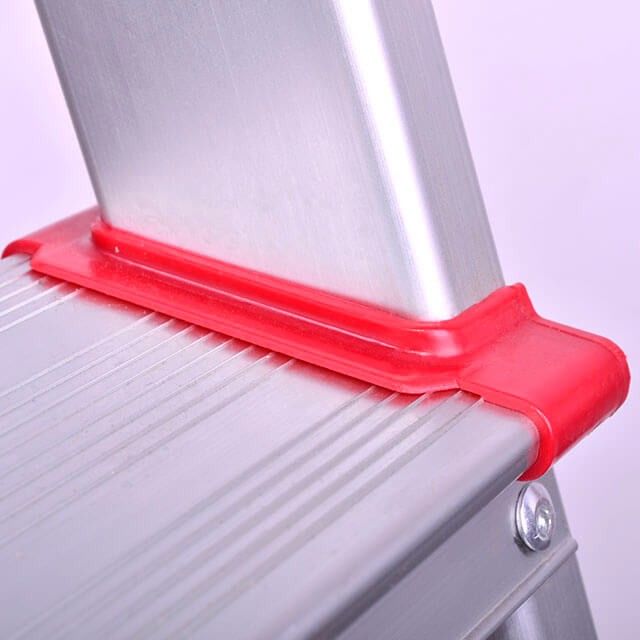 Лестница спроектирована с достаточной шириной между ножками, поэтому она очень устойчива, не качается. Ножки оснащены специальными противоскользящими рифлёными башмаками, они также защищают напольные покрытия от царапин и повреждений. На стремянке удобно стоять и работать, за счет верхней широкой платформы и ступеней с рифлением, а также поручня безопасности, за который можно держаться.