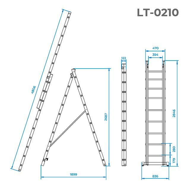 Конструкция позволяет использовать её и как стремянку и как приставную лестницу, а в сложенном виде имеет небольшие габариты для хранения. С помощью ремней и замков безопасности, вы с легкостью сможете установить лестницу в нужном вам положении. Функциональность лестницы может быть расширена с помощью дополнительной ступени-полки LT-6000.