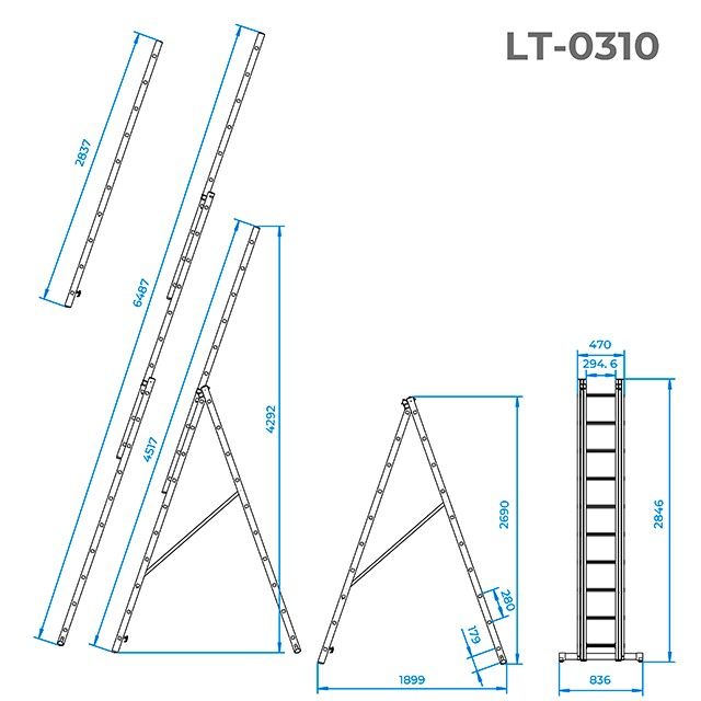 Конструкция позволяет использовать её и как стремянку и как приставную лестницу, а в сложенном виде имеет небольшие габариты для хранения. С помощью ремней и замков безопасности, вы с легкостью сможете установить лестницу в нужном вам положении. Функциональность лестницы может быть расширена с помощью дополнительной ступени-полки LT-6000.