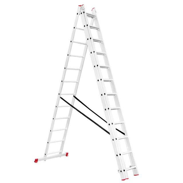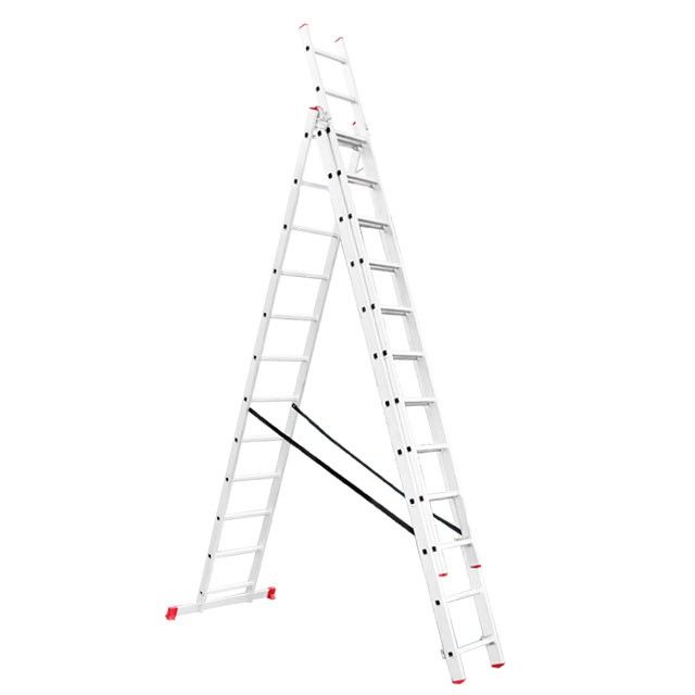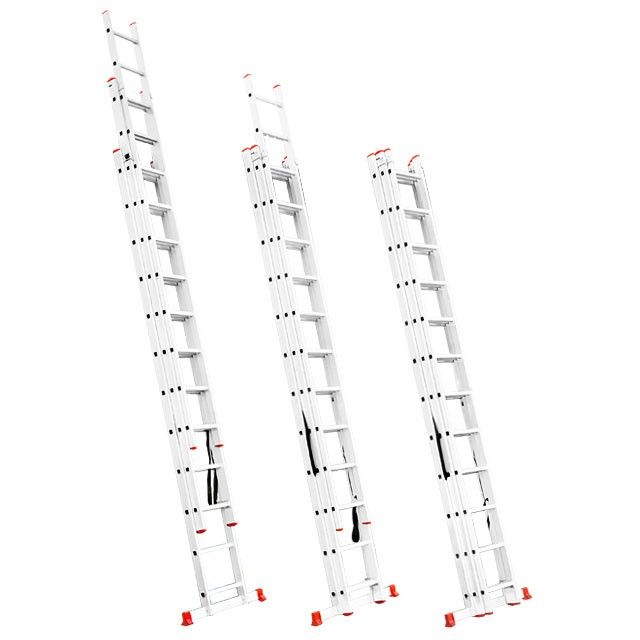 Складная трехсекционная лестница пригодится в любой ситуации, как для профессиональных мастеров для работы на высоте, так и для бытовых нужд, а также для работников складов, магазинов и пр. Она универсальная и подходит под любые задачи, максимальная высота составляет 7,89 метров, при этом лестница может трансформироваться в любое из 4 положений. Удобна для использования в домашнем хозяйстве, например, заменить лампочки, покрасить стены, помыть окна, также ее можно использовать в качестве чердачной лестницы и пр.