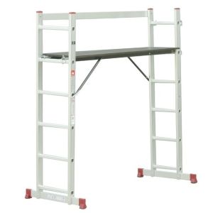 Лестница-помост имеет надежную, при этом легкую конструкцию из алюминия. Работать на ней безопасно и удобно, поскольку имеет широкую площадку (147х41 см), покрытую антискользящим покрытием, которая фиксируется на двух устойчивых приставных лестницах, по 6 ступеней. На такой площадке можно свободно передвигаться, а также использовать как подставку для различных инструментов и подручных вещей, которые понадобятся вам на высоте.