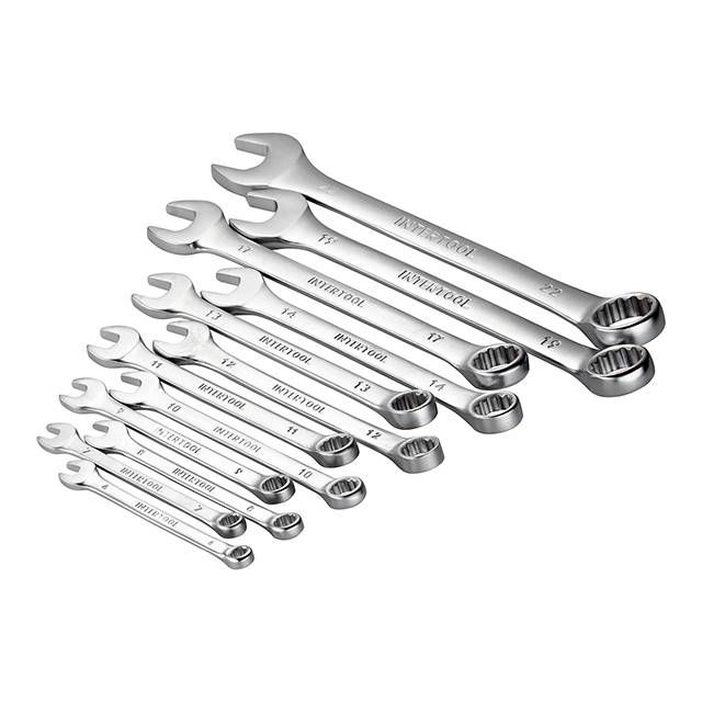 Набор рожково-накидных ключей INTERTOOL HT-1203 с широкой комплектацией: 6, 7, 8, 9, 10, 11, 12, 13, 14, 17, 19, 22 мм, позволяет подобрать необходимый ключ под любые задачи для монтажа и демонтажа резьбовых соединений гаек и болтов.