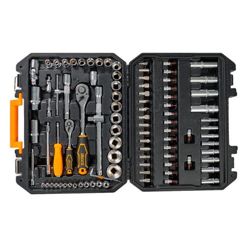 У набір входить: тріскачкове руків'я 45T 1/4 "(1 шт), тріскачкове руків'я 45T 1/2" (1 шт), торцеві головки 1/4 "(13 шт), торцеві головки глибинні 1/4" (8 шт), торцеві головки 1/2 "(18 шт), торцеві головки глибинні 1/2" (4 шт), біти 1/4 "(17 шт), біти 5/16" (15 шт), гнучкий подовжувач 1/4 " (1 шт), свічковий ключ 1/2 "(2 шт), подовжувачі 1/2" (4 шт), карданний шарнір 1/4 "(2 шт), комірець Т-подібний 1/4" (1 шт), руків'я 1/4 "(1 шт), тримач біт 1/4" (1 шт), тримач біт 1/2 "(1 шт), шестигранний ключ (3 шт), адаптер для трьох напрямків (1 шт).