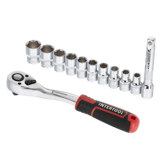 Набор головок STORM 1/2", 10-24 мм, удлинитель, рукоятка с храповым механизмом, 12 ед., Cr-V INTERTOOL ET-8014