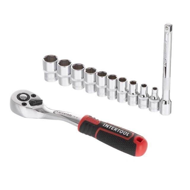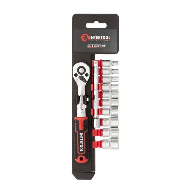 Набор головок STORM 1/4", 4-13 мм., удлинитель, рукоятка с храповым механизмом, 12 ед., Cr-V INTERTOOL ET-8012