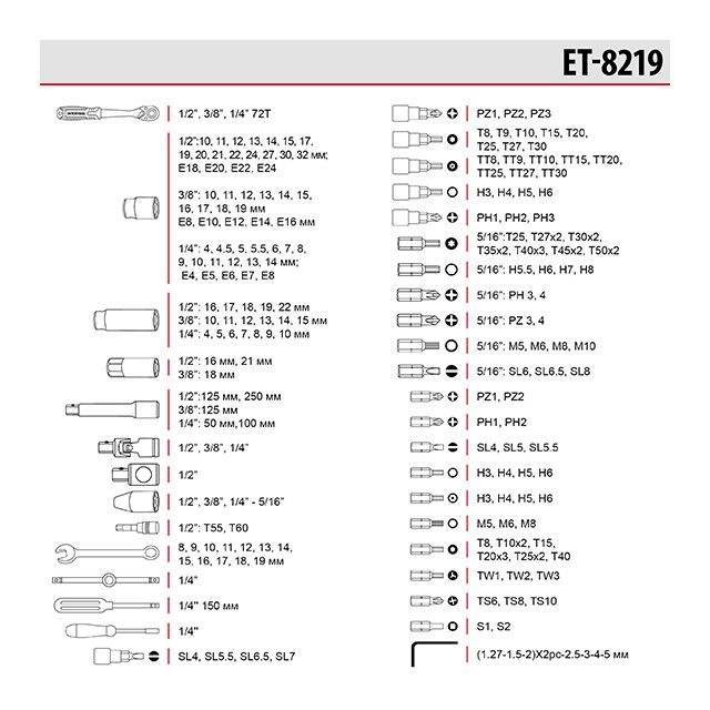 Данный набор выгодно отличается своей широкой комплектацией на 219 единиц. Основой набора являются три трещотки с посадочными квадратами: 1/2", 3/8", 1/4". Также в набор вошли: