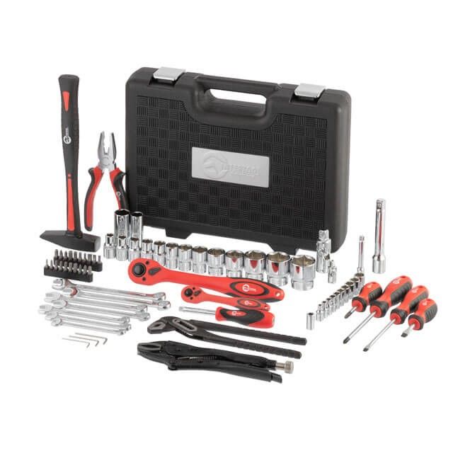 Здесь собраны все необходимые инструменты для быстрого выполнения любых ремонтных работ. Пассатижи, молоток, двое клещей, набор отверток и комбинированных ключей делают комплект желанным подарком для любого хозяина и профессионала.