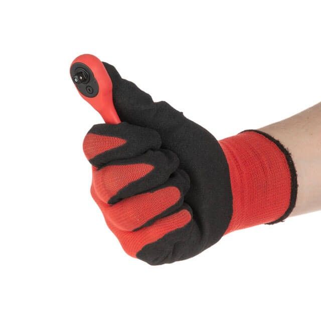Небольшой изгиб рукоятки увеличивает комфорт при работе с неудобно расположенными крепежами. Трещотка полностью покрыта защитным слоем полипропилена с резиновыми вставками на ручке, для прочной фиксации инструмента в руке.