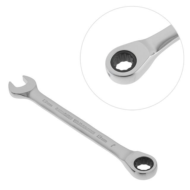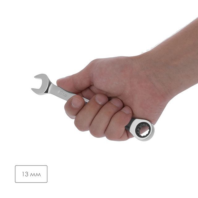 Комбинированный ключ с трещоткой, размером 13 мм предназначен для монтажа и демонтажа резьбовых соединений гаек и болтов.