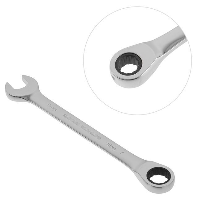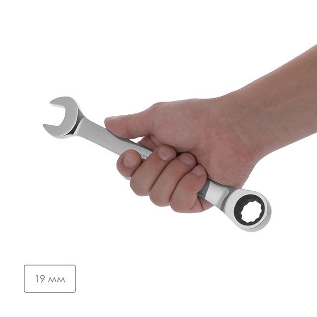 Комбинированный ключ с трещоткой, размером 19 мм предназначен для монтажа и демонтажа резьбовых соединений гаек и болтов.