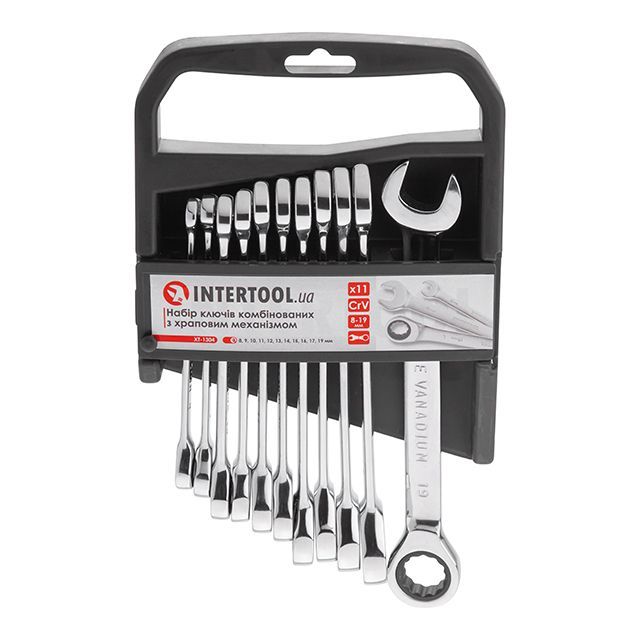 Набор ключей комбинированных с храповым механизмом 11ед., 8-19мм (8-9-10-11-12-13-14-15-16-17-19) Cr-V; PROF DIN3113 INTERTOOL XT-1304