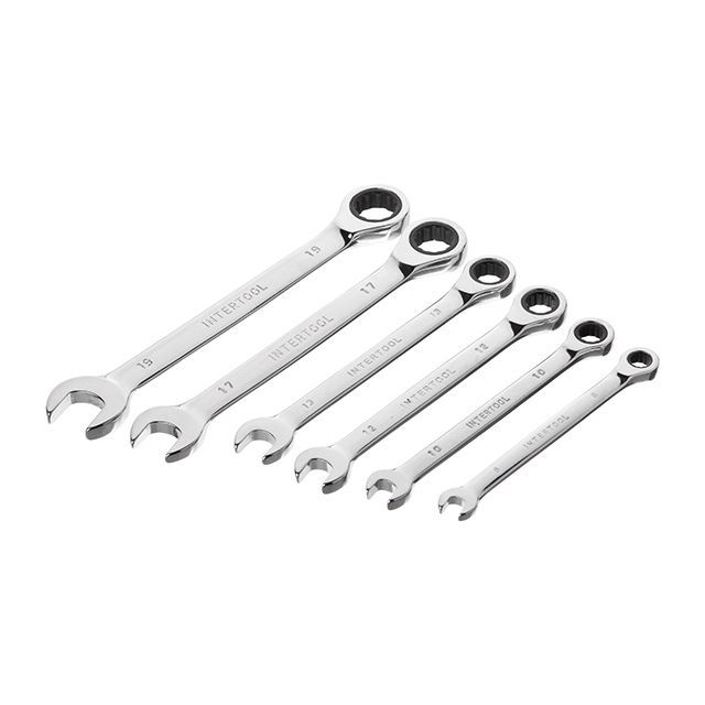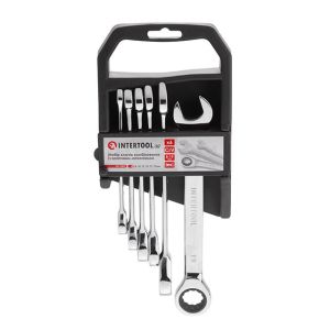 Набор рожково-накидных ключей с трещоткой INTERTOOL XT-1301 содержит наиболее популярные размеры: 8, 10, 12, 13, 17, 19 мм, что позволяет подобрать необходимый ключ под любые задачи для монтажа и демонтажа резьбовых соединений гаек и болтов.
