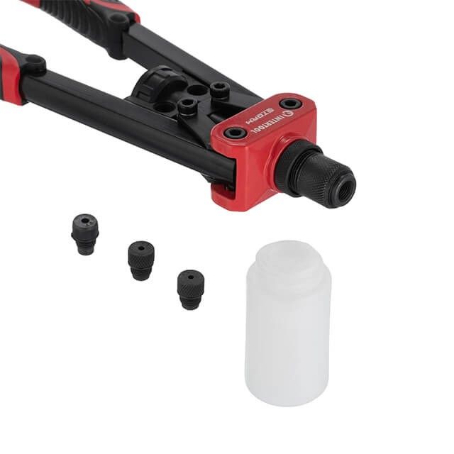 Заклепочник оснащен съемным контейнером для отработанной части заклепки, поэтому ничего не валяется на Вашем рабочем месте и не мешает в работе. Полностью прорезиненные рукоятки с рифленым нанесением обеспечивают надежный захват инструмента и противостоят соскальзыванию даже испачканных рук. Все насадки оснащены специальными насечками для их быстрой и комфортной замены в инструменте.