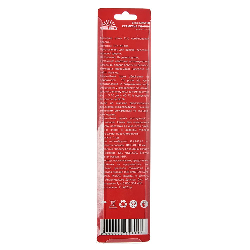 Стамеска 10×140 мм Vitals Master - це інструмент для різання та вирізування дерев'яних деталей різної форми та складності. Використовується для вибірки пазів, отворів, фігурного різання у деревині твердих та м'яких порід з використанням молотка чи киянки. Виготовлена з високоякісної сталі CrV, яка забезпечує довговічність та міцність стамески. Металевий наконечник на торці руків'я дозволяє завдавати ударів молотком або киянкою і докладати більше сили для інтенсивнішої вибірки матеріалу. Ширина стамески становить 10 мм, а довжина – 140 мм. Подовжене ергономічне руків'я з м'якими гумовими вставками для кращого хвату в руці та надійного контролю інструменту в процесі роботи.