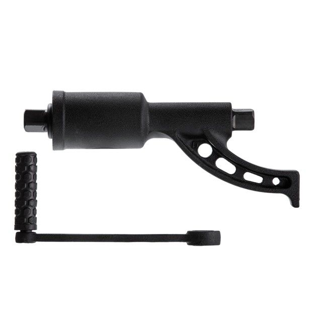 Перед началом работы необходимо установить рукоятку и выбрать торцевую головку соответствующего размера. Для более комфортной и эффективной работы с ключом предусмотрена специальная ножка, которая упирается в диск, обеспечивая стабильное положение. Ручка же имеем текстурированное покрытие из вспененного каучука для лучшей фиксации в руке.