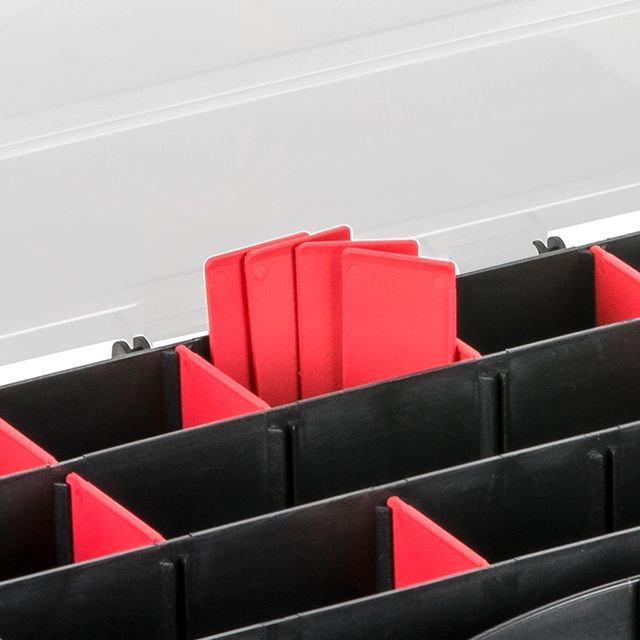Внутри органайзера предусмотрено 15 ячеек со съемными перегородками для размещения крепежных элементов: метизов, фурнитуры, запчастей, рыболовных принадлежностей и прочих мелочей. При этом размер ячейки можно сформировать самостоятельно, извлекая нужную перегородку.