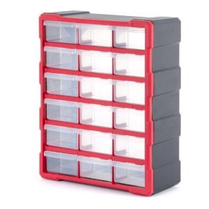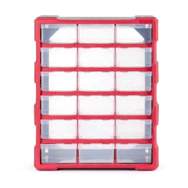 Органайзер выполнен из прочного пластика и вмещает в себя 18 лотков одинакового размера: 140х110*60 мм.