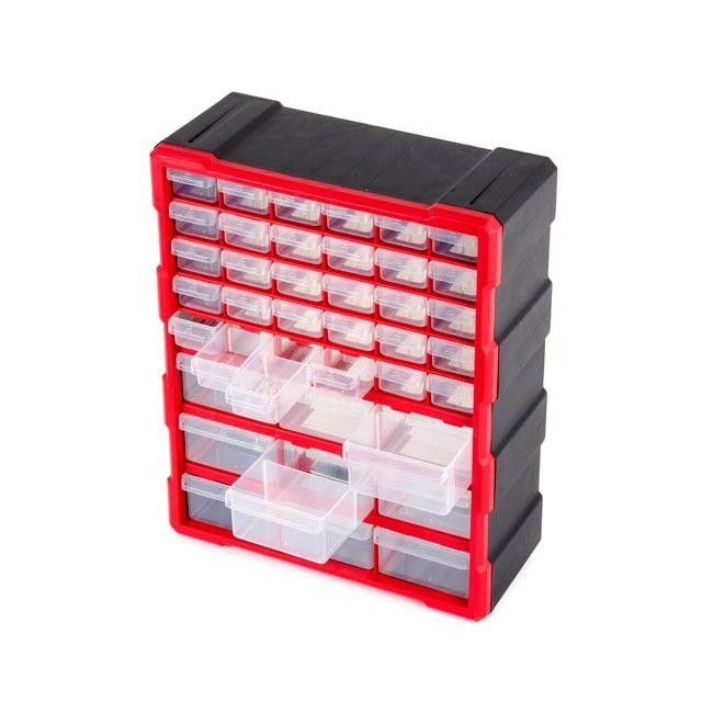 Органайзер выполнен из прочного пластика и вмещает в себя 39 лотков двух размеров: большие 140х110х60 мм, малые 140х50х35 мм.