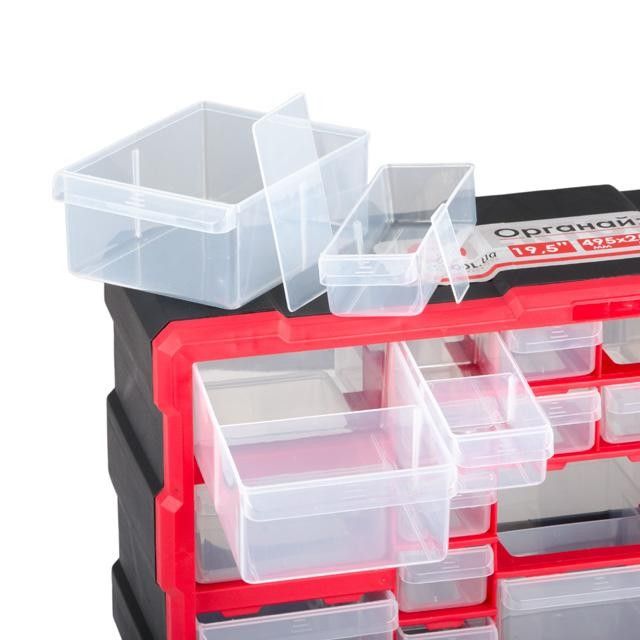 Прозрачные стенки позволяют увидеть, что хранится в лотках и упрощают процесс поиска. Удобные ручки помогают выдвигать лотки, а ограничители на верхних стенках ячеек не позволяют им выпадать.