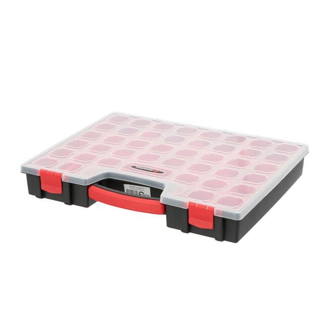 Органайзер изготовлен из прочного, толстого пластика. Два замка надежно прижимают крышку и не дают пересыпаться даже небольшим деталям.