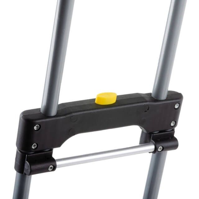 Тележка изготовлена из стали, служит надежно и долговечно. Выдвижная ручка, удобная по высоте (960 мм), фиксируется замком как в сложенном, так и в разложенном виде. Откидная стальная платформа с габаритами 385х235 мм позволяет быстро подхватывать груз. Надежная, не гнется и не деформируется благодаря ребрам жесткости, рифленой поверхности и загнутому опорному краю.