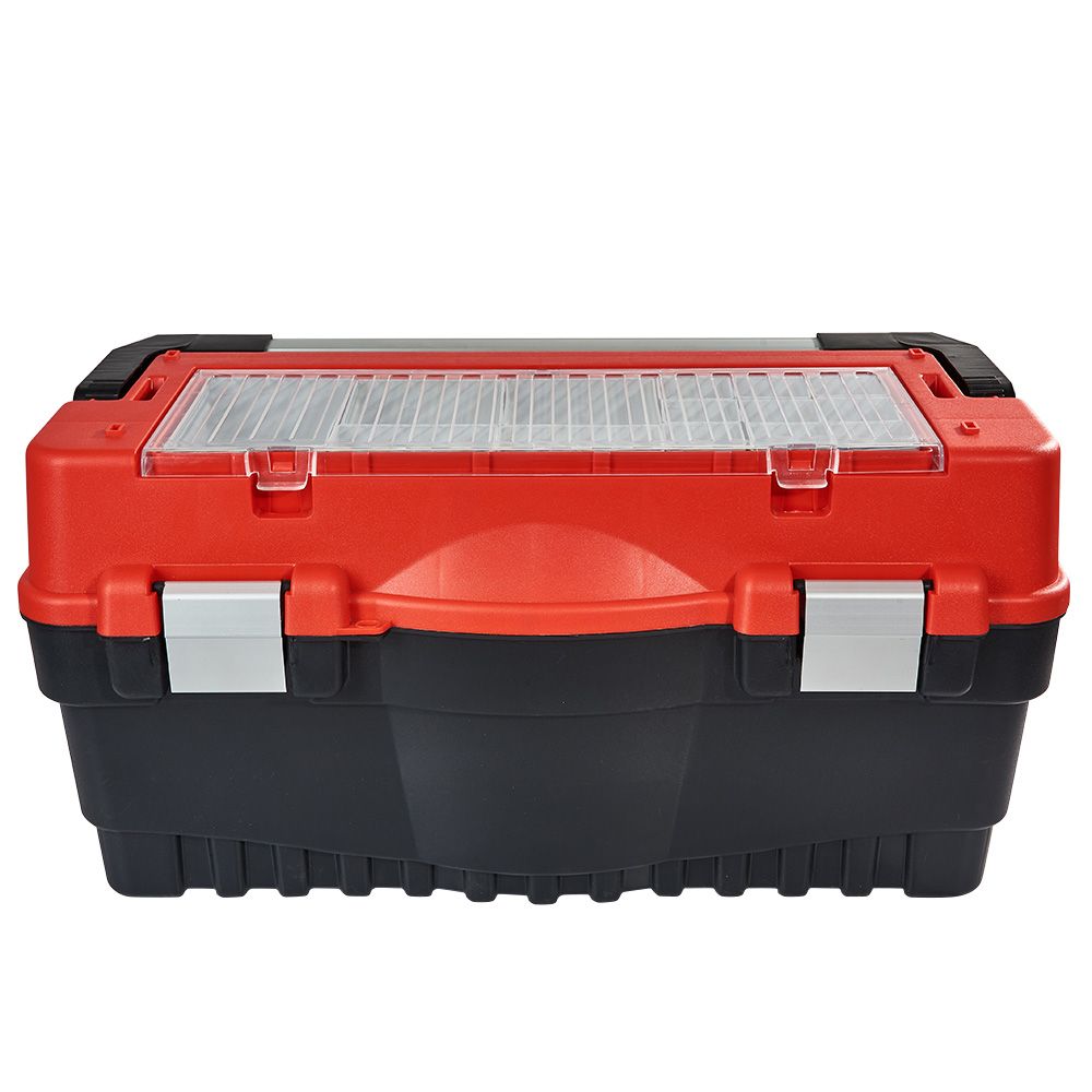 У верхній частині виробу знаходиться органайзер з переставними роздільниками та прозорою кришкою з полікарбонату, яку надійно утримують і не дають випадково розкритися металеві замки високої якості. Наявність органайзерів допомагає систематизувати зберігання дрібних деталей та витратних матеріалів: цвяхів, шайб, гайок, свердел та багато іншого. Є переносний знімний лоток для інструментів з гніздами для біт.