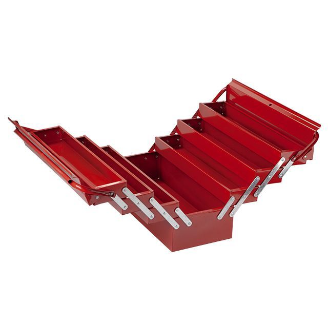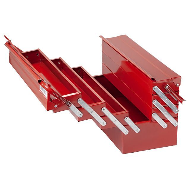 При открытии верхние отделения выдвигаются, открывая полный доступ к содержимому и к нижнему отделению для хранения. Малые боксы разъезжаются в стороны, обеспечивая полный обзор внутреннего пространства каждого из них. На верхней крышке предусмотрено отверстие для замка для безопасного хранения содержимого. Также две металлические ручки для удобной переноски и транспортировки.
