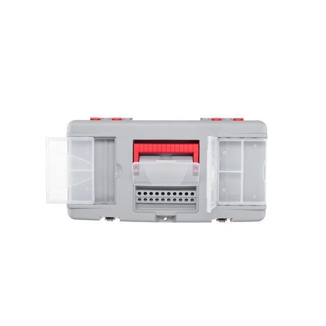 На крышке ящика расположено два съемных органайзера, которые отлично подойдут для хранения метизов или любой другой мелочи. Также сверху предусмотрен отсек для бит, который закрывается прозрачной крышкой. Внутри ящика размещена полка для хранения губцевого и другого небольшого, часто используемого инструмента.