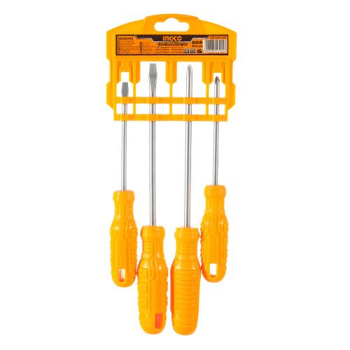 Набір викруток 4 шт INGCO містить в комплекті дві викрутки з прямим шліцом і дві викрутки з хрестовим. Інструменти використовуються для закручування і відкручування кріпильних елементів з різьбленням.