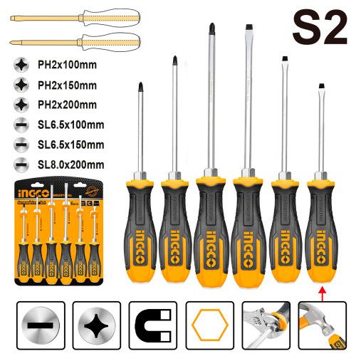 Набір ударних викруток 6 шт INGCO INDUSTRIAL містить в комплекті три викрутки з прямим шліцом і три викрутки з хрестовим.