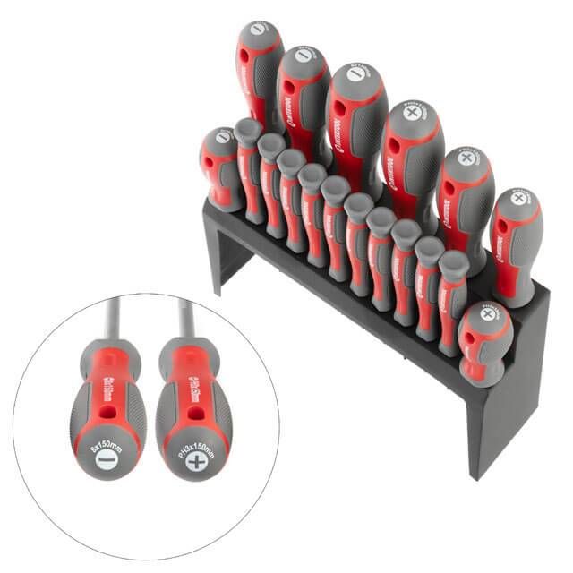 Форма ручек обеспечивает максимальную эффективность от приложенного усилия. Прорезиненная двухкомпонентная рукоятка удобно лежит в руке и не выскальзывает из ладони. Яркая маркировка на конце рукоятки позволяет быстро найти необходимый тип и размер отвертки.