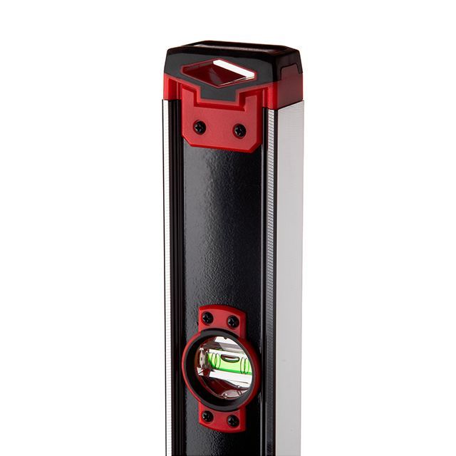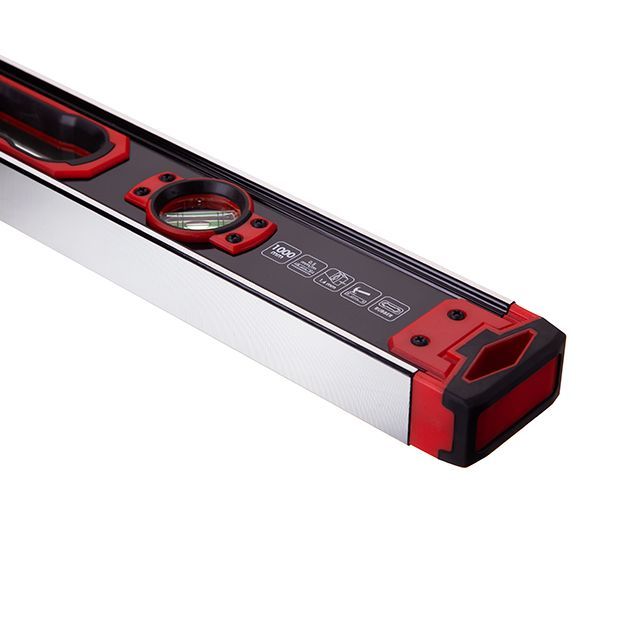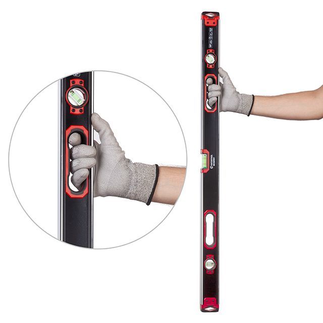 Уровень оснащен тремя капсулами: двумя вертикальными и одной горизонтальной, что позволяет работать в вертикальной и горизонтальной плоскостях. При этом горизонтальная колба увеличена и имеет шесть отметок для удобного считывания показателей под любым углом, а две вертикальные колбы позволят не переворачивать лишний раз уровень при измерениях.