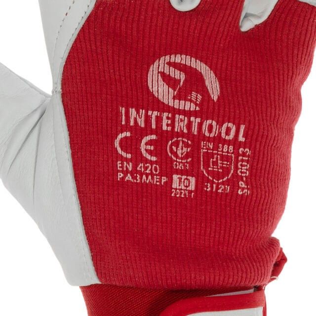 Перчатка кожаная комбинированная из ткани и высококачественной кожи с подкладкой, 10", эластичный манжет на липучке INTERTOOL SP-0013