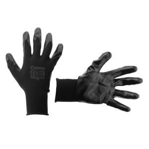 Ладони перчаток покрыты черным нитрилом для более стойкой защиты рук от загрязнений и механических повреждений. При этом перчатки не сковывают движений пальцев. Имеют вязаный манжет для фиксации на запястье против попадания вовнутрь пыли и мелких частиц.