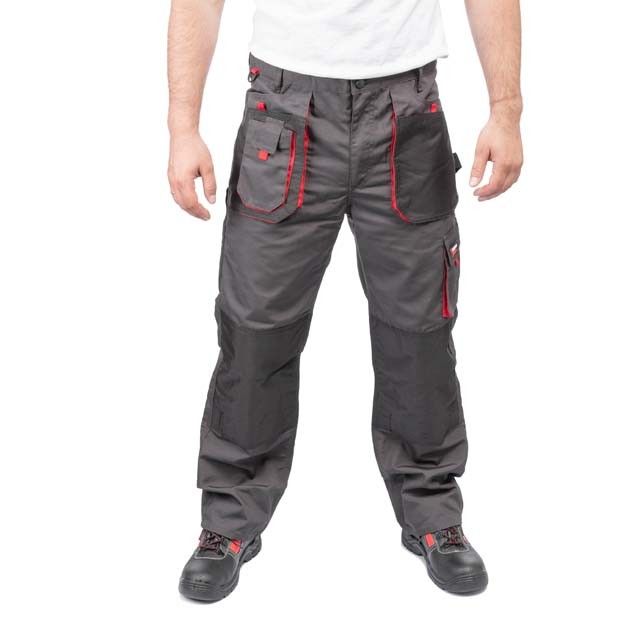 Рабочие брюки темно-серого цвета изготовлены из прочной ткани: 80% полиэстер и 20% хлопок с плотностью 260 г/м². Наличие множества карманов позволяет разгрузить руки и обеспечивает быстрый доступ для подручного инструмента.