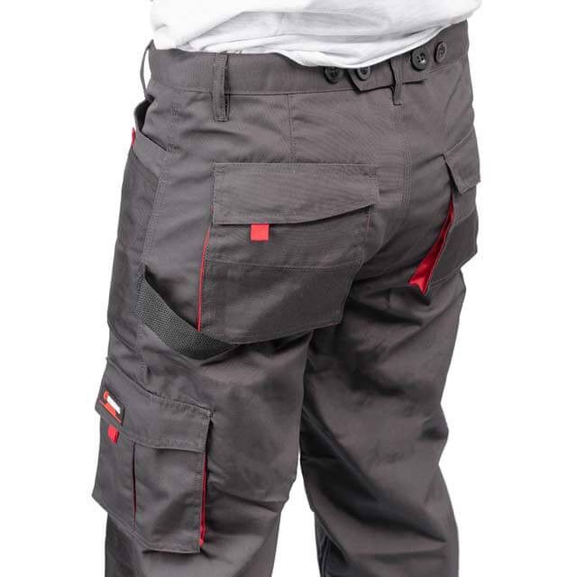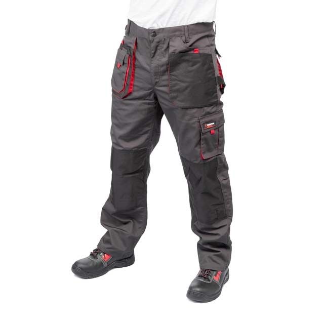 Рабочие брюки темно-серого цвета изготовлены из прочной ткани: 80% полиэстер и 20% хлопок с плотностью 260 г/м². Наличие множества карманов позволяет разгрузить руки и обеспечивает быстрый доступ для подручного инструмента.